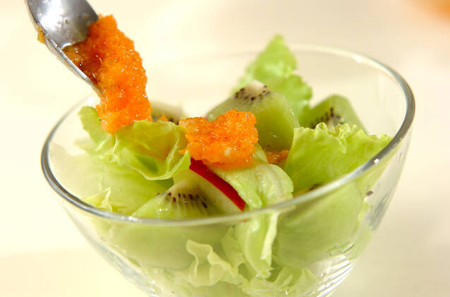 器にレタス、フルーツを盛り合わせ、<ニンジンドレッシング>をかける。