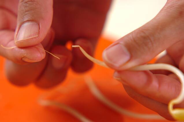 豆モヤシはひげ根をとって洗う。水からゆで、沸騰したらザルにあけ、水に放つ。よく絞り水気をきる。