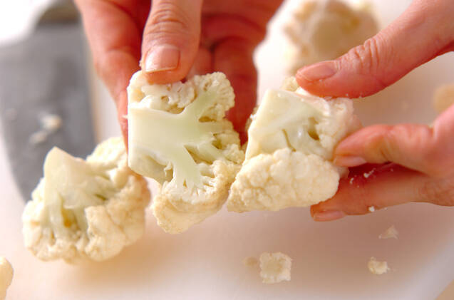 カリフラワーは小房に分け、熱湯でゆでザルに上げ、冷ましておく。