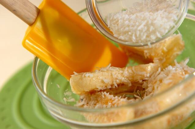 バナナから水分が出てきたら、ココナッツロングをまぶす。