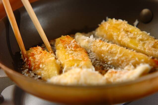 フライパンにココナッツオイルを入れ、バナナを揚げ焼きにする。衣が揚がったらクッキングペーパ―の上にのせて軽く油をきり、皿に盛る。