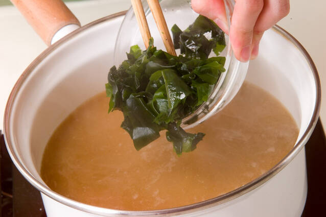 煮立てばみそを溶き入れ、ワカメ、刻みネギを加えて火を止め、お椀によそう。