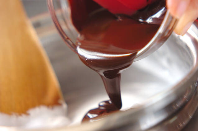 <チョコフォンダン>を作る。カカオマスをボウルに入れ、湯せんで溶かして50℃を保っておく。フォンダンを手で練って柔らかくしてから小鍋に入れ、水少々を加えて弱火にかけながら木ベラで練り混ぜる。トロミがついてきたら湯せんにかけ、混ぜながらツヤを出し、溶かしたカカオマスとラム酒を加え混ぜる。