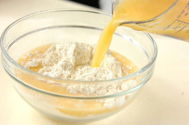 卵を溶きほぐし、だし汁を合わせて泡立て器でよく混ぜ、1に加えてまんべんなく混ぜる。