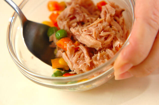 ミックスベジタブルはザルに入れてサッと熱湯をかけ、水気をきってツナと混ぜ合わせる。
