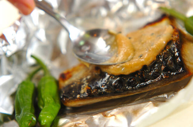 いったん取り出して皮目に<みそマヨ>をぬり、シシトウと共に焼き色がつくまで焼く。