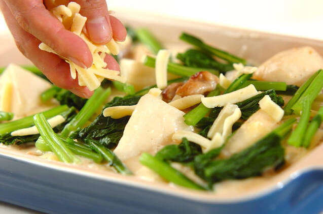 <ホワイトソース>と(3)の炒め物を混ぜ合わせ、グラタン容器に入れる。カブの葉をのせてピザ用チーズを散らす。 250℃に予熱しておいたオーブンで12~15分、おいしそうな焼き色がつくまで焼く。