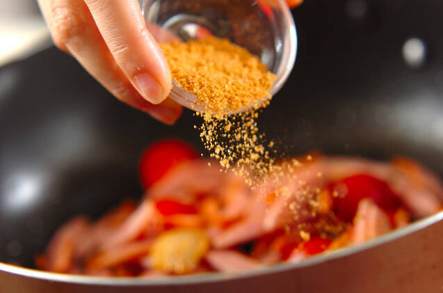 ゆでている間に、フライパンにオリーブ油、ニンニクを入れて弱めの中火にかける。香りがたってきたら、ソーセージ、プチトマトを加えて炒め合わせ、焼き色がついたらタコシーズニングスパイスを加えてサッと炒める。(ヒント)タコシーズニングスパイスとは、タコスの具などによく使用される、味付け調味料です。