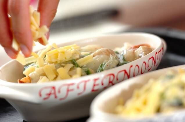 耐熱皿にバゲットを並べ、(2)をかけてピザ用チーズをのせ、220℃に予熱しておいたオーブンで10分ほど焼く。