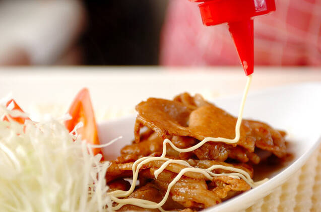 器にキャベツとトマト、豚肉を盛り合わせ、マヨネーズをかける。