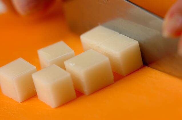 春巻きの皮は1枚を4等分に、角餅は8等分に切る。