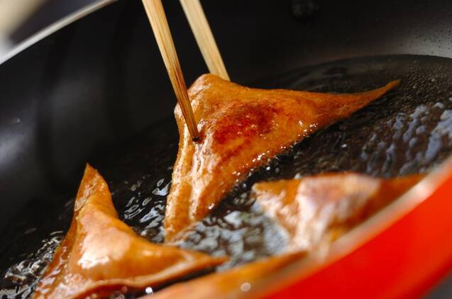 フライパンに多めのサラダ油を熱し、(1)を両面こんがりと揚げ焼きにし、器に盛る。