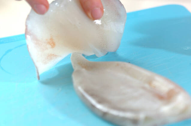 イカは足を持って胴から引き抜く。胴はエンペラを取って1枚に開き、皮をむく。縦3等分に切り、細切りにする。足は目の際からワタを切り離し、くちばしを取って皮をむく。足を切り揃えて1本ずつに切り離す。