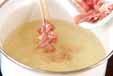 鍋にだし汁を入れ強火にかけ、煮立てば鶏肉を加える。