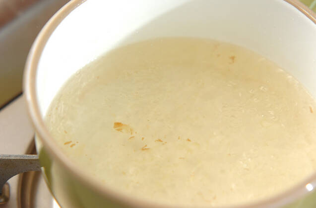 鍋にショウガ、グラニュー糖、水を入れて中火にかける。アクが出てきたら取り除く。煮たったら火を弱め、クツクツしている位の火加減で3~4分煮る。