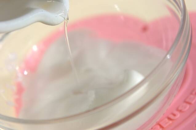 <シロップ>を少しずつ加えてよく泡立て、さらにレモン汁を加えて泡立てる。