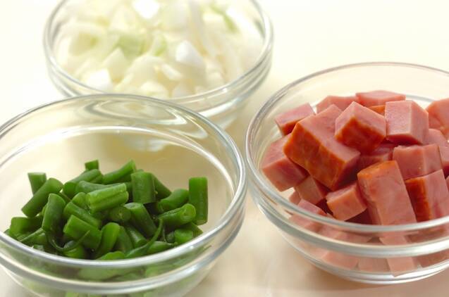 ベーコンは1cm角に切る。玉ネギは粗みじん切りにする。サヤインゲンは軸側を少し切り落とし、熱湯で1~1分30秒ゆでて水に取り、幅1cmに切る。