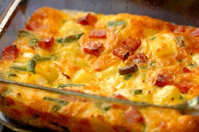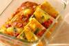 分量外のサラダ油を薄くぬった耐熱容器に(2)を入れ、200℃に予熱しておいたオーブンに入れ、表面に焼き色が付くまで25~30分焼く。食べやすい大きさに切り、ケチャップを添える。