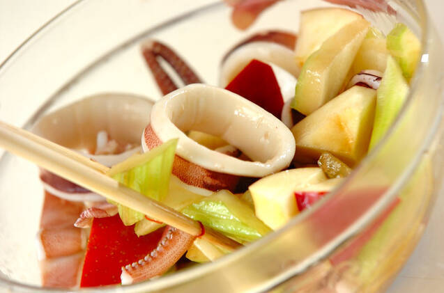 <ドレッシング>にイカとセロリ、リンゴを加えて混ぜ合わせ、器に盛る。