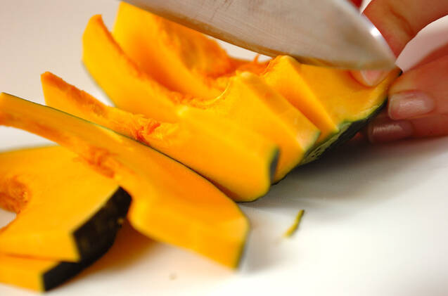カボチャは種とワタを取り、横半分に切って、さらに薄切りにする。