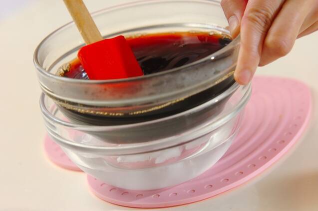 底を氷水にあてて時々混ぜ、トロミがついたらラップをして冷蔵庫で冷やしかためる。