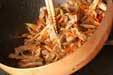 <調味料>を加え、汁気がほとんどなくなるまで炒め合わせ、白ゴマをからめ器に盛る。
