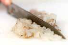 エビは背ワタを取り包丁で細かくたたく。キャベツは熱湯でサッとゆでみじん切りにする。白ネギ、ショウガは細かいみじん切りにする。