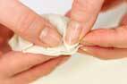 餃子の皮に、よく混ぜ合わせた<種>の1/10量をのせ、皮の縁に水をつけヒダを寄せながら形を整え包む。10個作る。鍋に<スープ>の材料を入れて強火にかけ、煮立てば餃子を加える。
