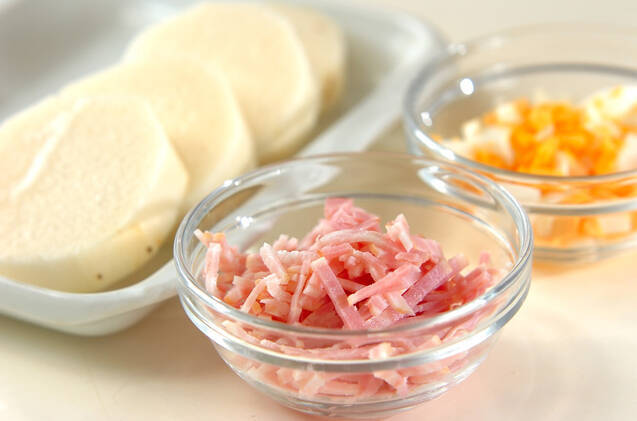 長芋は皮をむいて幅2cmに切り、耐熱皿に入れてラップをかけ、電子レンジで10分程加熱する。電子レンジは600Wを使用しています。