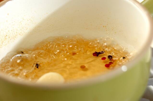 <漬け汁>のニンニクは芽を取り、赤唐辛子は軸と種を取って半分に割る。他の材料と合わせてひと煮たちさせ、冷ましておく。