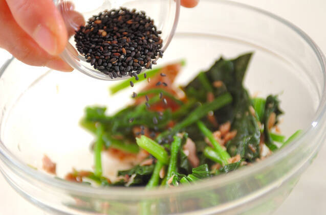 (1)に<調味料>の材料とツナ、黒ゴマを加え、和える。