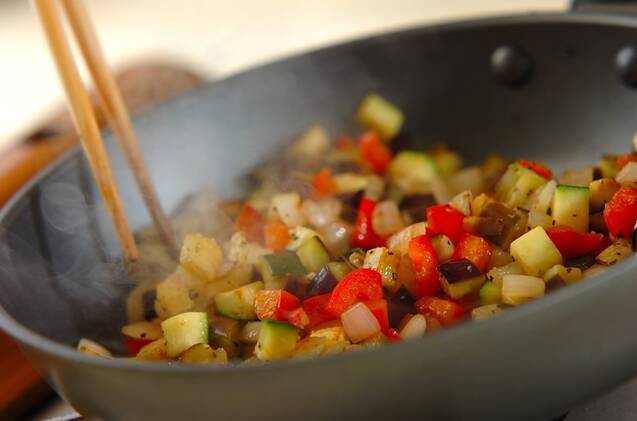 フライパンに分量外のオリーブ油小さじ1を熱し、<具>の材料を全て加える。しんなりするまで炒めて塩、コショウをし、バットに取り出して冷ます。