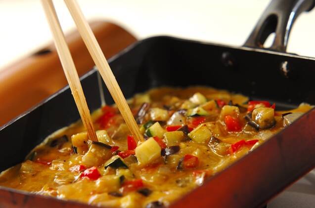 (1)を<卵液>のボウルに加え、卵焼き器に小さじ2のオリーブ油を熱し、<卵液>の半分量を一気に加え、菜ばしで大きく混ぜながら半熟状態まで焼く。