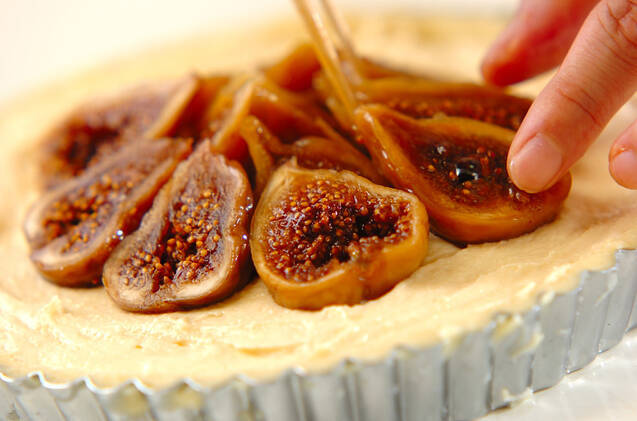 (6)に(5)の<クレームダマンド>を入れてまんべんなくのばし、その上に食べやすい大きさに切った(3)の<ドライイチジクのシロップ煮>を並べ、180℃に予熱しておいたオーブンで30~40分焼く。