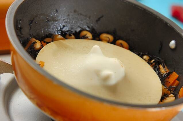 鍋にゴマ油を中火で熱し、ヒジキ、ニンジン、水煮大豆、水煮タケノコを炒める。ニンジンがしんなりしたら、<調味料>の材料を加えて全体にからめる。だし汁を加えて、落とし蓋をして煮汁がほとんどなくなるまで煮る。