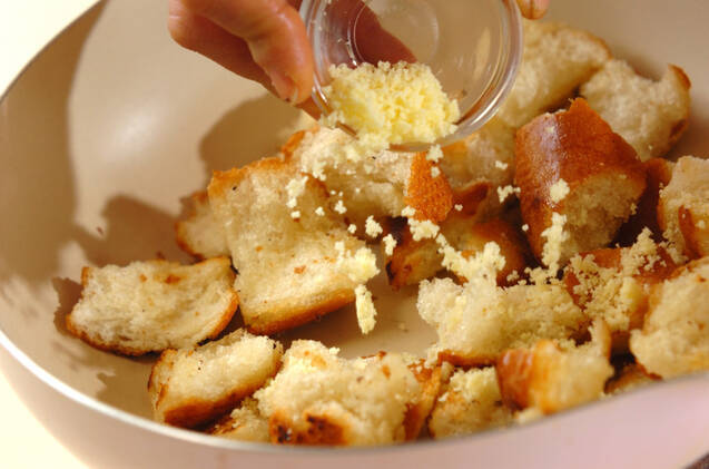 フランスパンはひとくち大にちぎってオリーブ油をしみこませ、粗びき黒コショウを振る。フライパンで煎るように薄いキツネ色に炒め、熱いうちに粉チーズをからめて粗熱を取る。