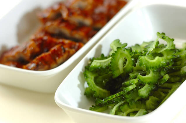 ゴーヤはスプーンで種とワタを取り除き、薄い半月切りにする。分量外の塩でもみ、少ししんなりしたら水洗いして水気を絞る。ウナギ蒲焼きは頭を切り落とし、大きい場合は縦半分に切り、さらに幅1.5~2cmに切る。卵は溶きほぐしておく。