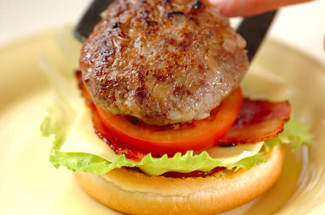 焼き上がったバンズにマスタードをぬり、具材とケチャップ、マヨネーズをはさむ。