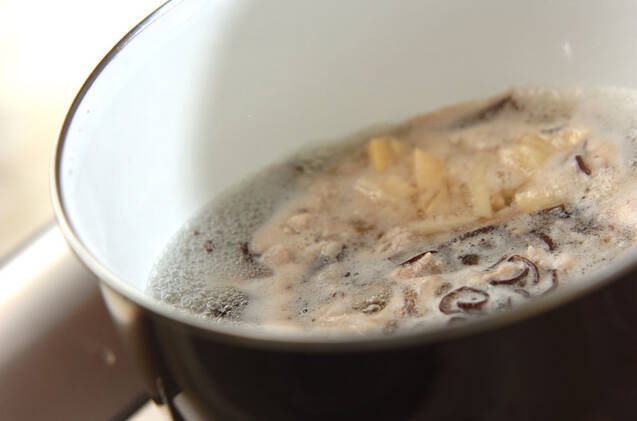 鍋に水と鶏ガラスープの素を入れて煮たたせ、キクラゲ、水煮タケノコ、豚肉を加えて1~2分煮る。