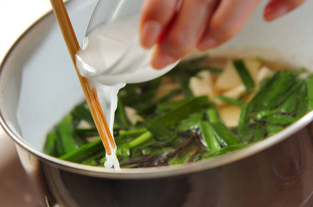 <調味料>の材料、ニラ、絹ごし豆腐を加えてひと煮たちしたら、混ぜ合わせた<水溶き片栗>を加えてトロミをつける。