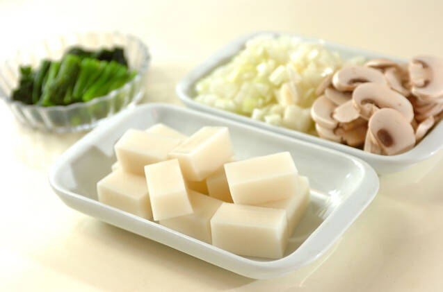 角餅は1切れを4つに切る。<ミートソース>の玉ネギはみじん切りにする。マッシュルームは汚れを拭き取り、縦薄切りにする。ホウレン草は水洗いしてたっぷりの熱湯でゆで、水に取って粗熱が取れたら水気を絞る。根元を少し切り落とし、長さ3cmに切る。