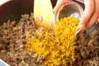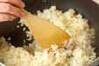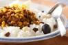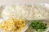 トウモロコシは外皮を取り、半分の長さに切り、包丁で身を削ぎ落とす。塩を入れた熱湯に入れ、再び煮立てば1~2分ゆで、ザルに上げる。