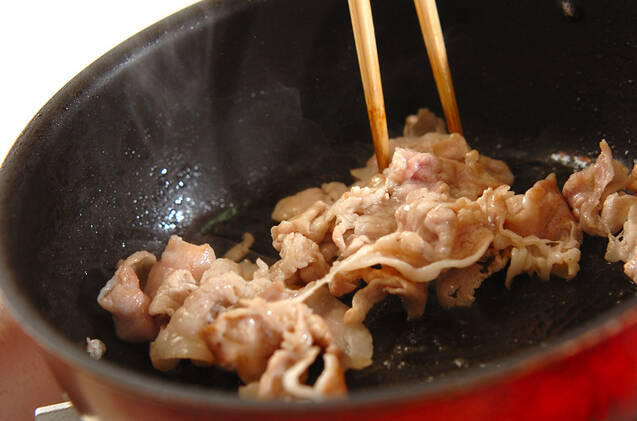 フライパンにゴマ油を中火で熱し、食べやすい大きさに切った豚肉を加えて炒める。