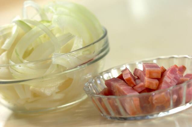 玉ネギは薄切りにする。ベーコンは幅1cmに切る。オーブンを230℃に予熱する。