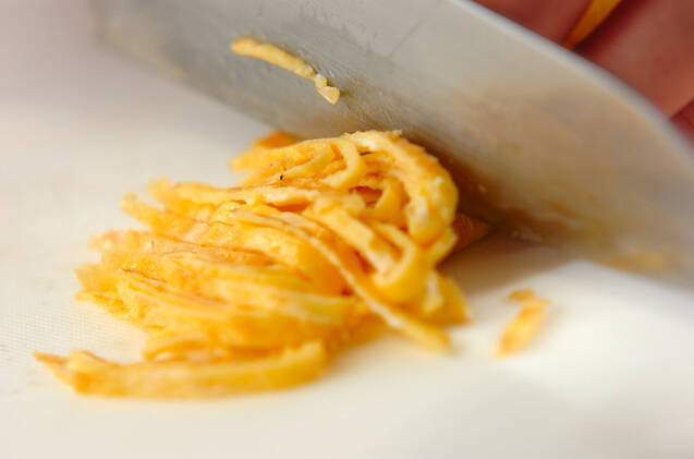 錦糸卵を作る。フライパンにサラダ油を薄くひいて薄焼き卵を焼き、冷めたら何枚かに重ねて細切りにする。