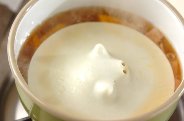 鍋にだし汁、<調味料>の材料、カボチャ、ベーコンを入れて落とし蓋をし、さらに蓋をして強火にかける。煮たったら火を弱め、13分煮る。
