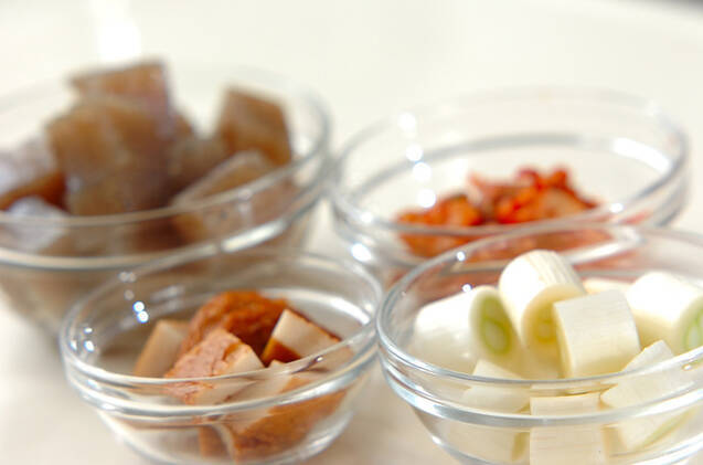 板コンニャクは表面に切り込みを入れ、小さめのひとくち大に切って熱湯でゆでる。白ネギは2cmのぶつ切りにする。さつま揚げは小さめのひとくち大に切る。白菜キムチが大きい場合はザク切りにする。