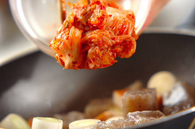 フライパンに板コンニャクを入れて中火で水分を飛ばすように炒め、ゴマ油、白ネギ、さつま揚げを加えて炒める。白菜キムチ、<合わせだし>の材料を加えて煮汁が少なくなるまで煮る。