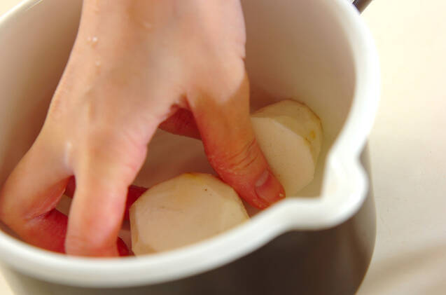里芋(またはエビ芋)は皮をむき、大きい場合は2~4つに切る。塩を加えてかるくもみ、鍋に入れてヒタヒタの水を加えて火にかける。5~6分、竹串がスッと刺さるくらい柔らかく下ゆでし、ザルに上げる。