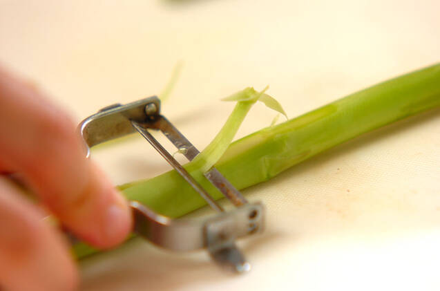 グリーンアスパラは根元を少し切り落とし、ピーラー等でハカマとかたい皮を削ぎ落とし、長さ2cmに切る。塩を加えた熱湯でゆで、ザルに上げる。